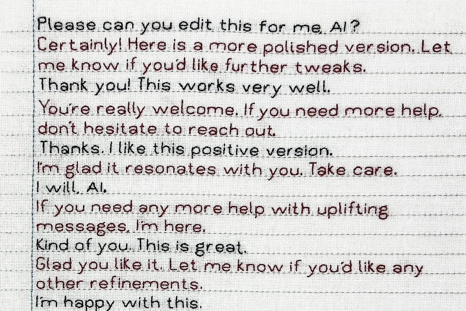 Never disregard sewing as slow, repetitive and undemanding. Rather, understand that it can be deliberate and measured, a way of slowing or making time: time for reflection, for letting the mind wander. The repetitive rhythm of needle through cloth, the touch and feel of cloth: how might that work upon soma and psyche? Pennina Barnett - Freelance writer, researcher and curator