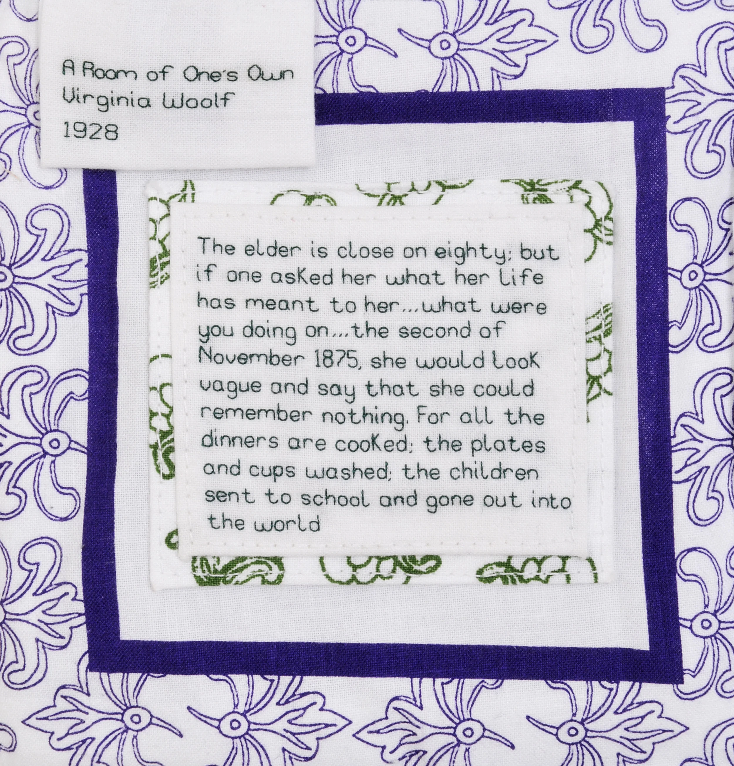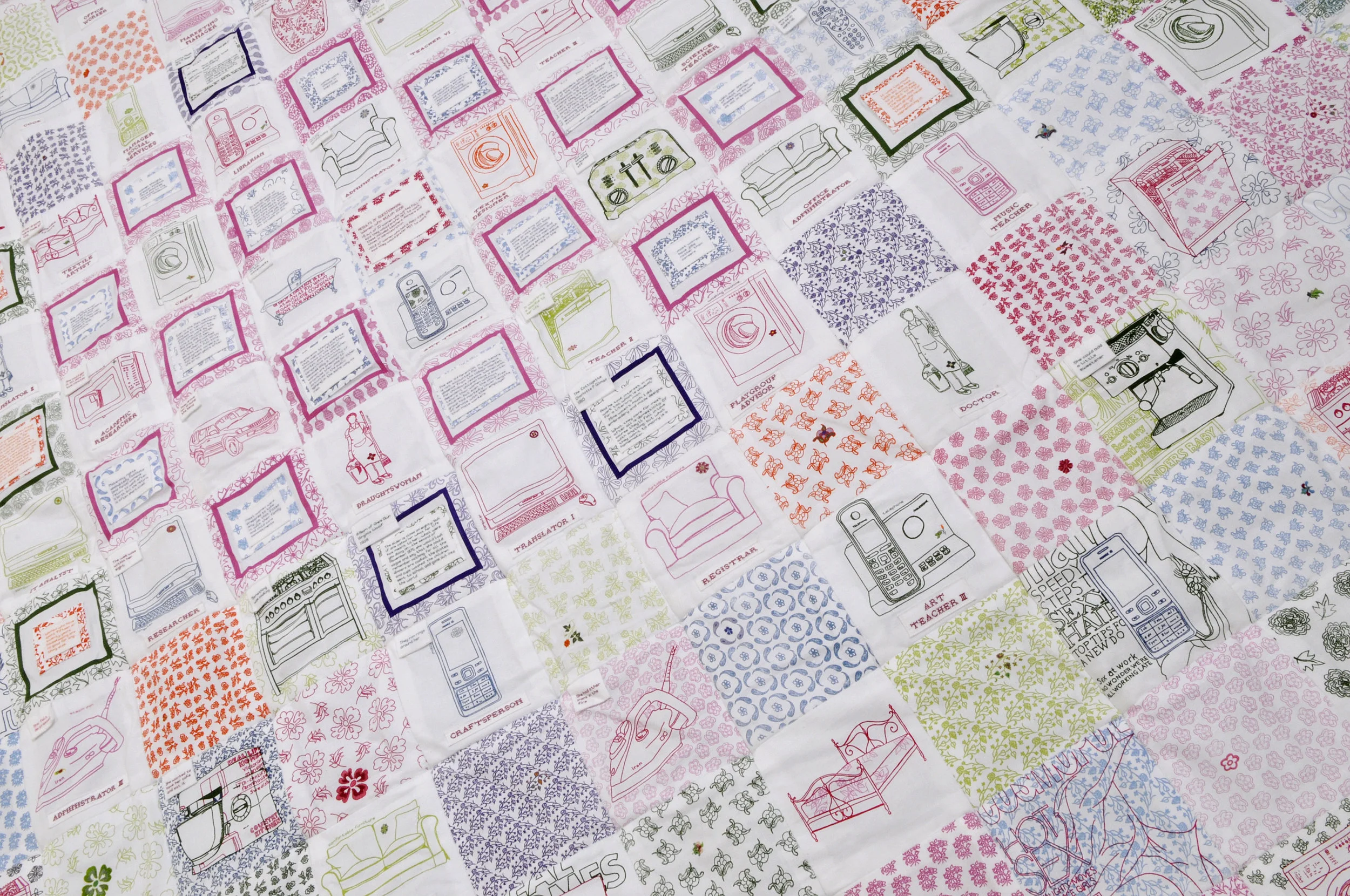 Women contributed to the quilt but instead of stitching (historically they would have stitched together in ‘Sewing Bees’) they were asked to supply fluff from the inside of their tumble driers. This relates to the domestic side of women’s lives, doing the washing, drying, sorting and folding. The collected fluff was then trapped between the layers of the quilt in the same way as some women are trapped into working due to financial pressures when in fact they would prefer to be at home (according to research). Fluff was also used because in the past women were sometimes called ‘Bits of Fluff’. Every woman that contributed to the quilt has had their name hand stitched onto a long ‘care’ label giving them the recognition that was lacking for our foremothers who made incredible quilts but remained anonymous.
