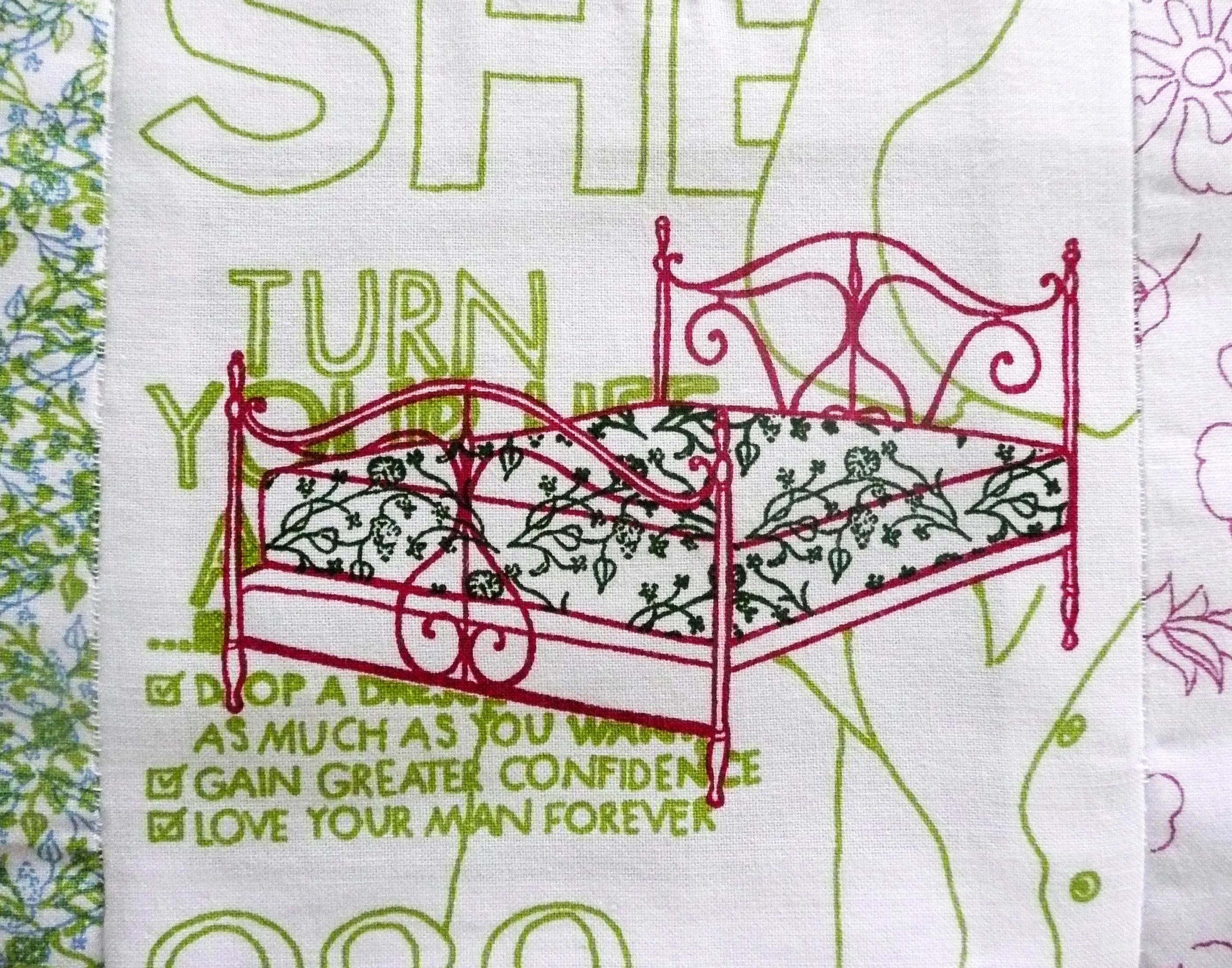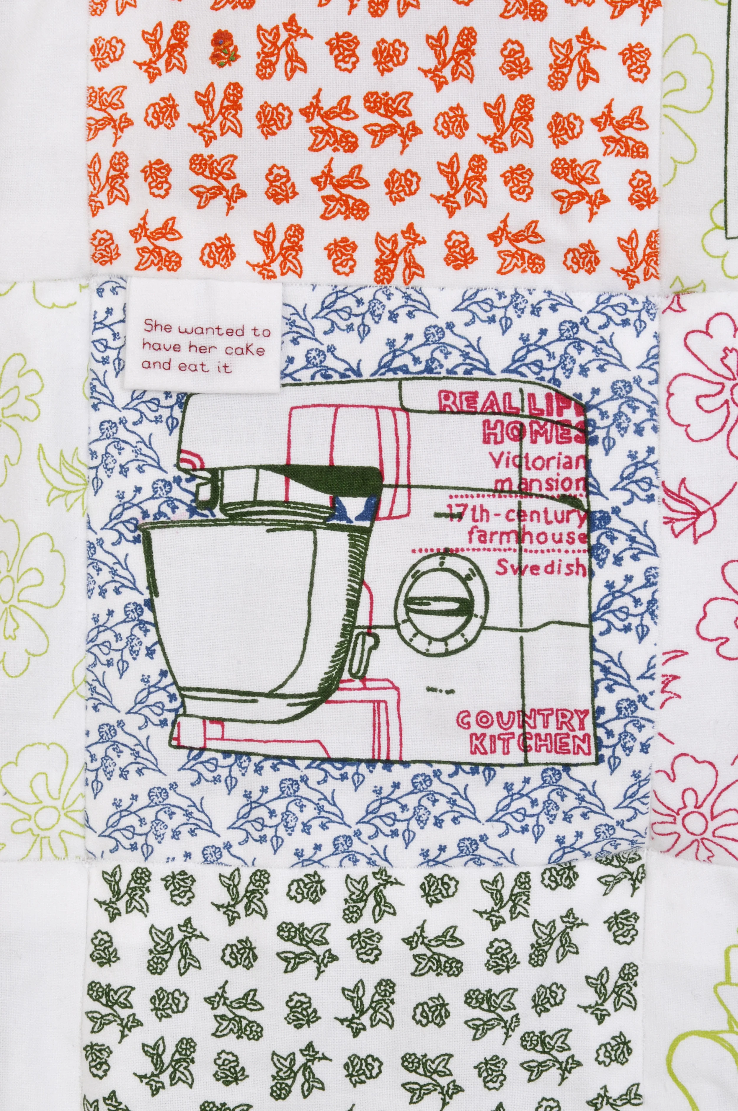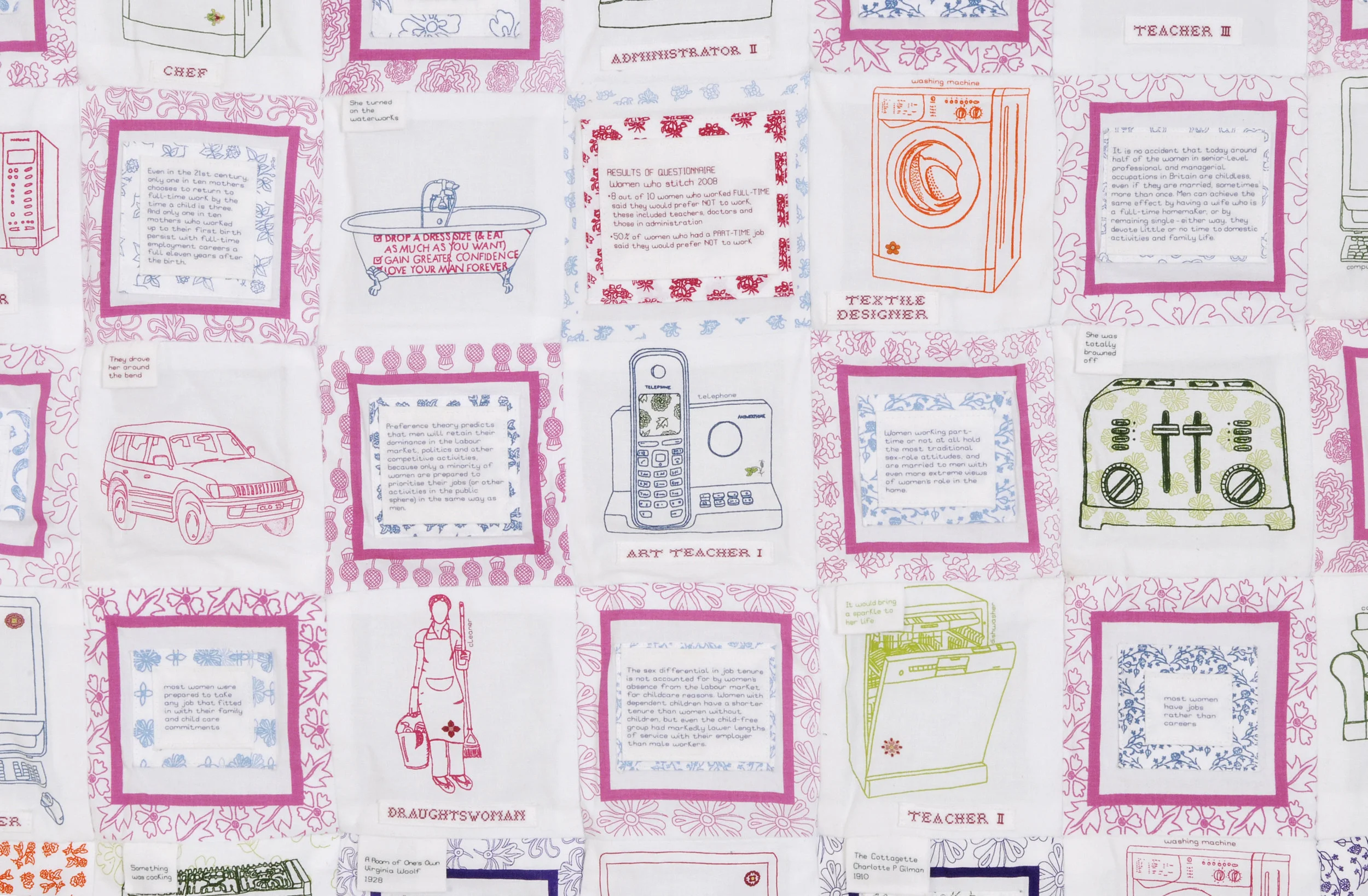 The painstaking hand-stitched text adds a layer of humour that thinly veils a stark social statement: ‘She had the weight of the world on her shoulders’ accompanies an image of weighing scales, while ‘She was programmed to do it all’ sits alongside a television set. Sue Prichard, curator
