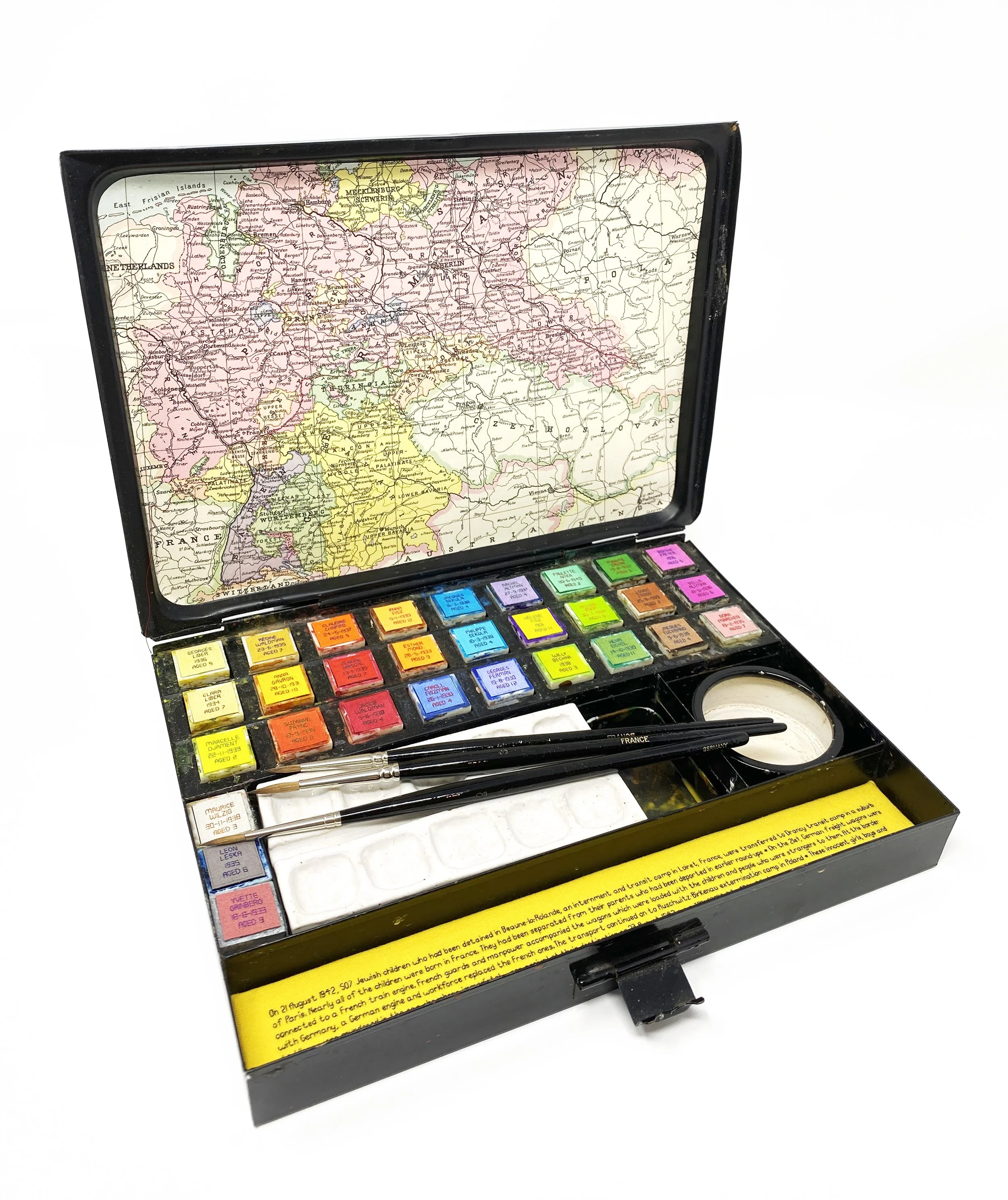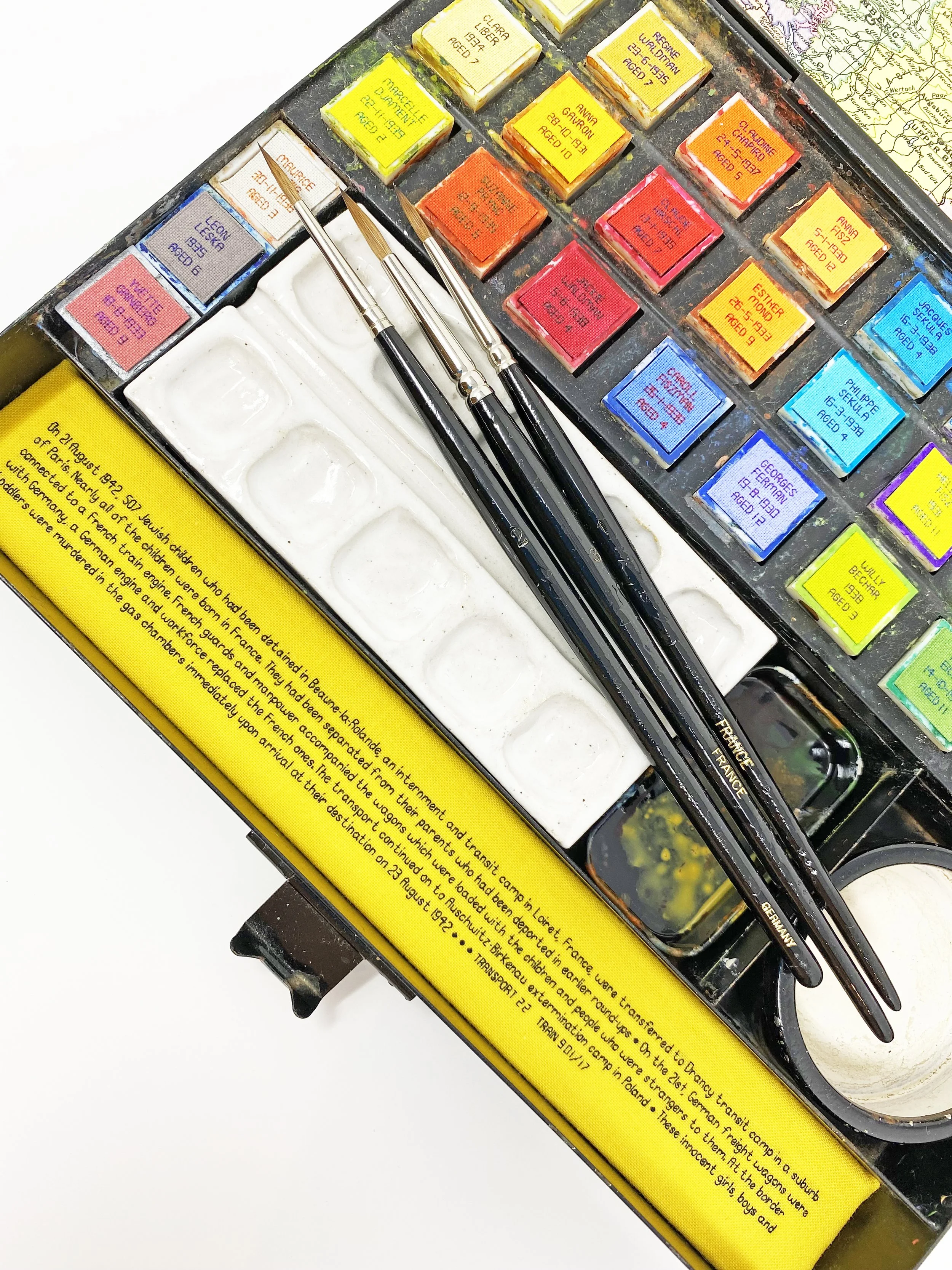 In Painting a Grim Picture, 30 children, aged from 2 to 12, all born in Paris, France, are memorialised in a vintage paint box. Their tragic lives were cut short so there was no time to enjoy the simple pleasures of childhood such as colouring and painting pictures. These innocent children were among 507 boys, girls and toddlers who were on Transport 22, Train 901/17. They were sent directly to Auschwitz after suffering a most distressing journey. They were gassed immediately upon arrival. There are no photographs to remember them by. May their souls rest in peace.